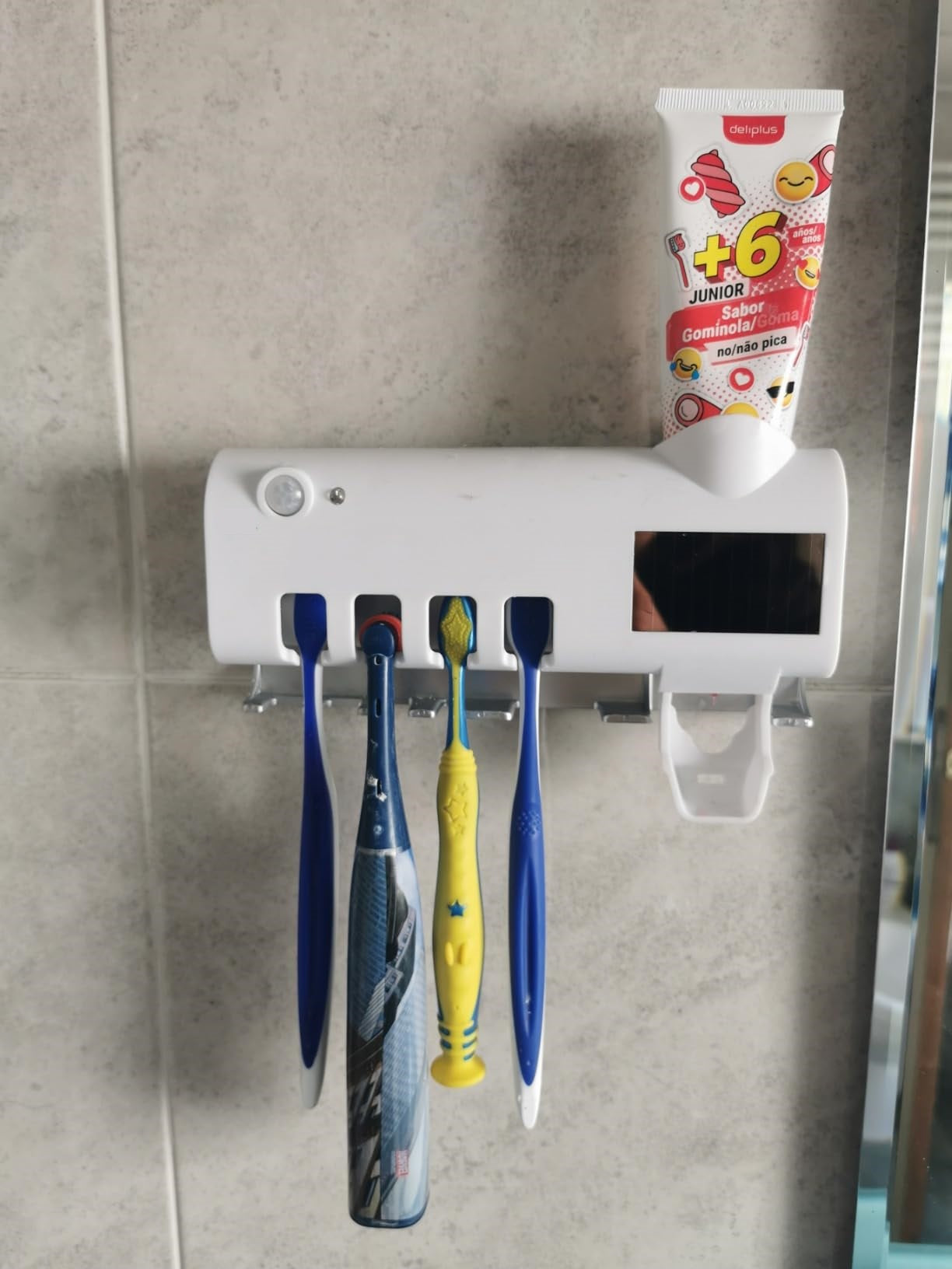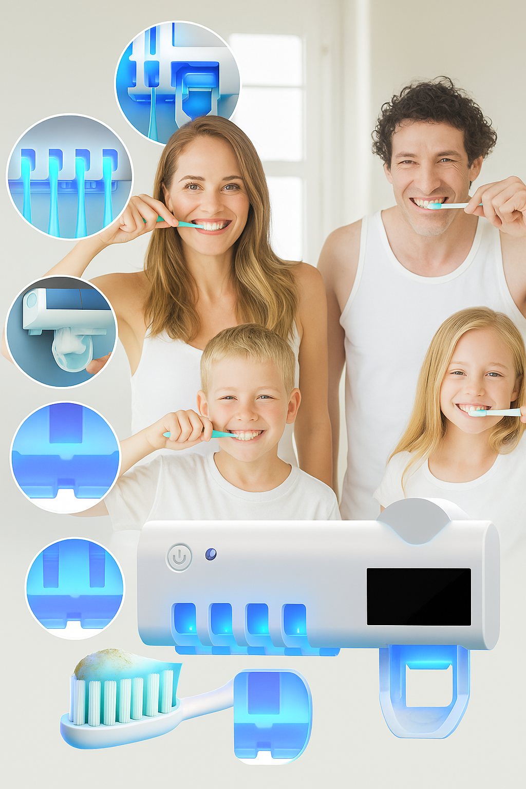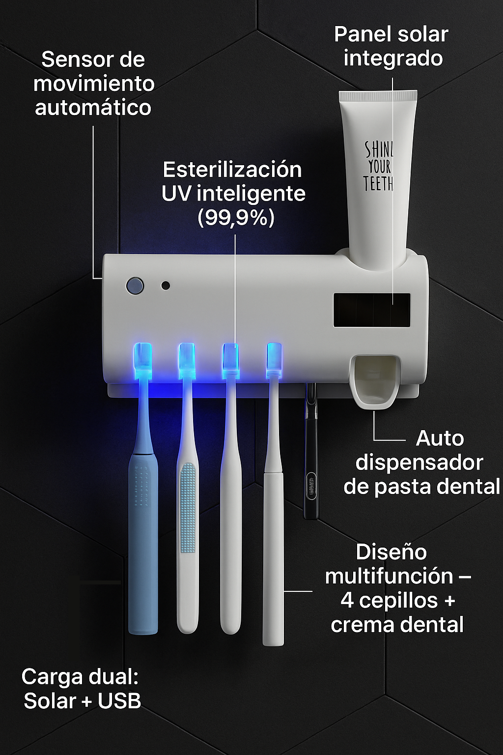 Pero eso no es todo: también ofrece un diseño compacto y multifuncional que no solo esteriliza, sino que dispensa pasta dental automáticamente, organiza tus cepillos (manuales o eléctricos), afeitadoras, hilo dental y más, todo en un solo lugar.