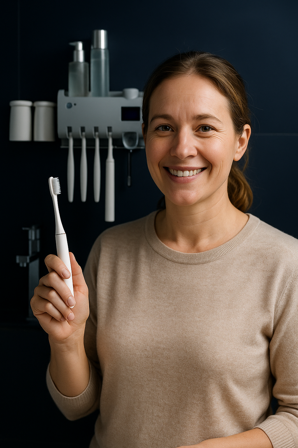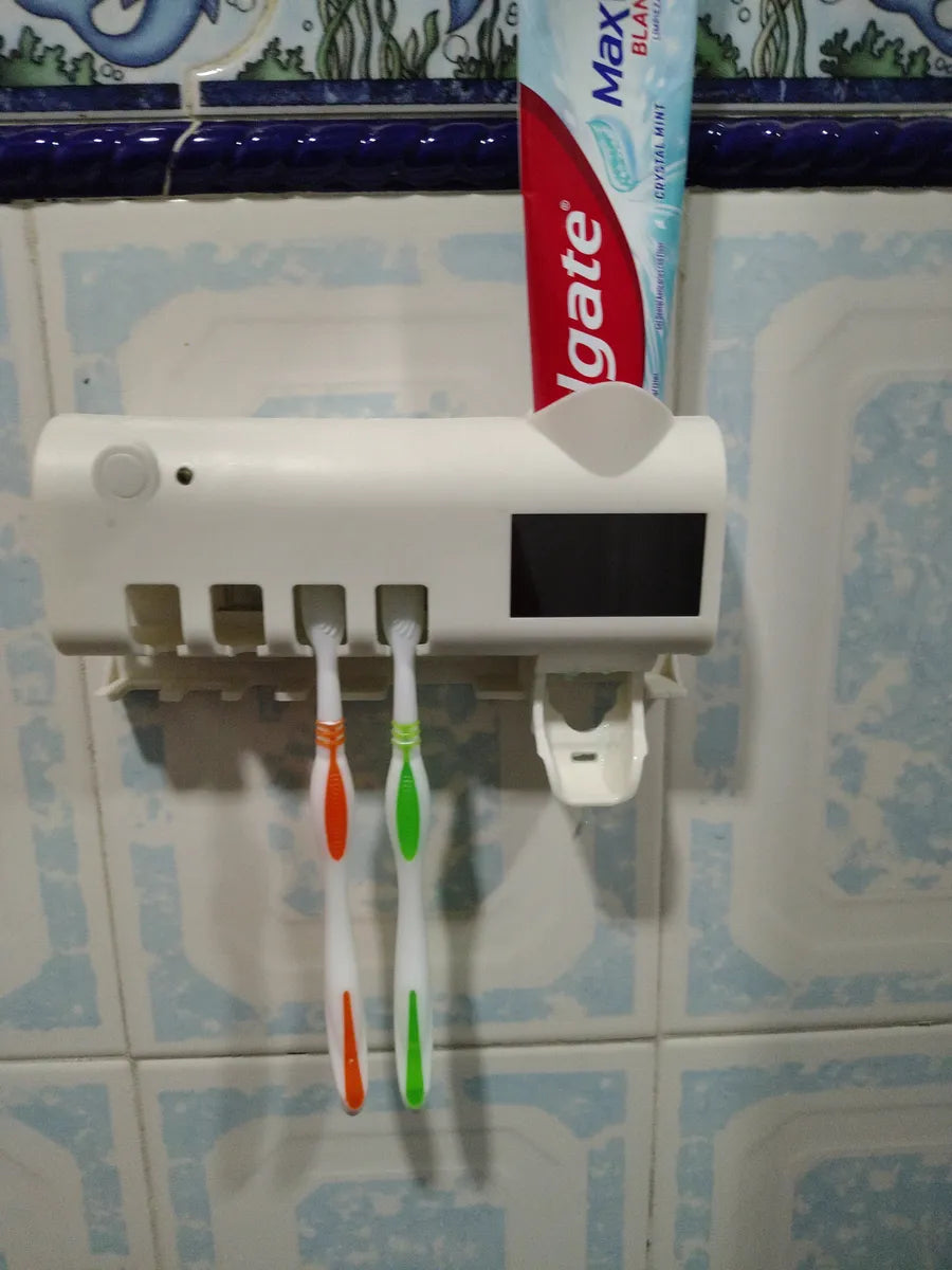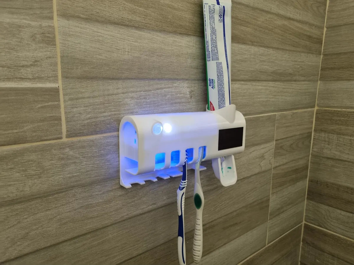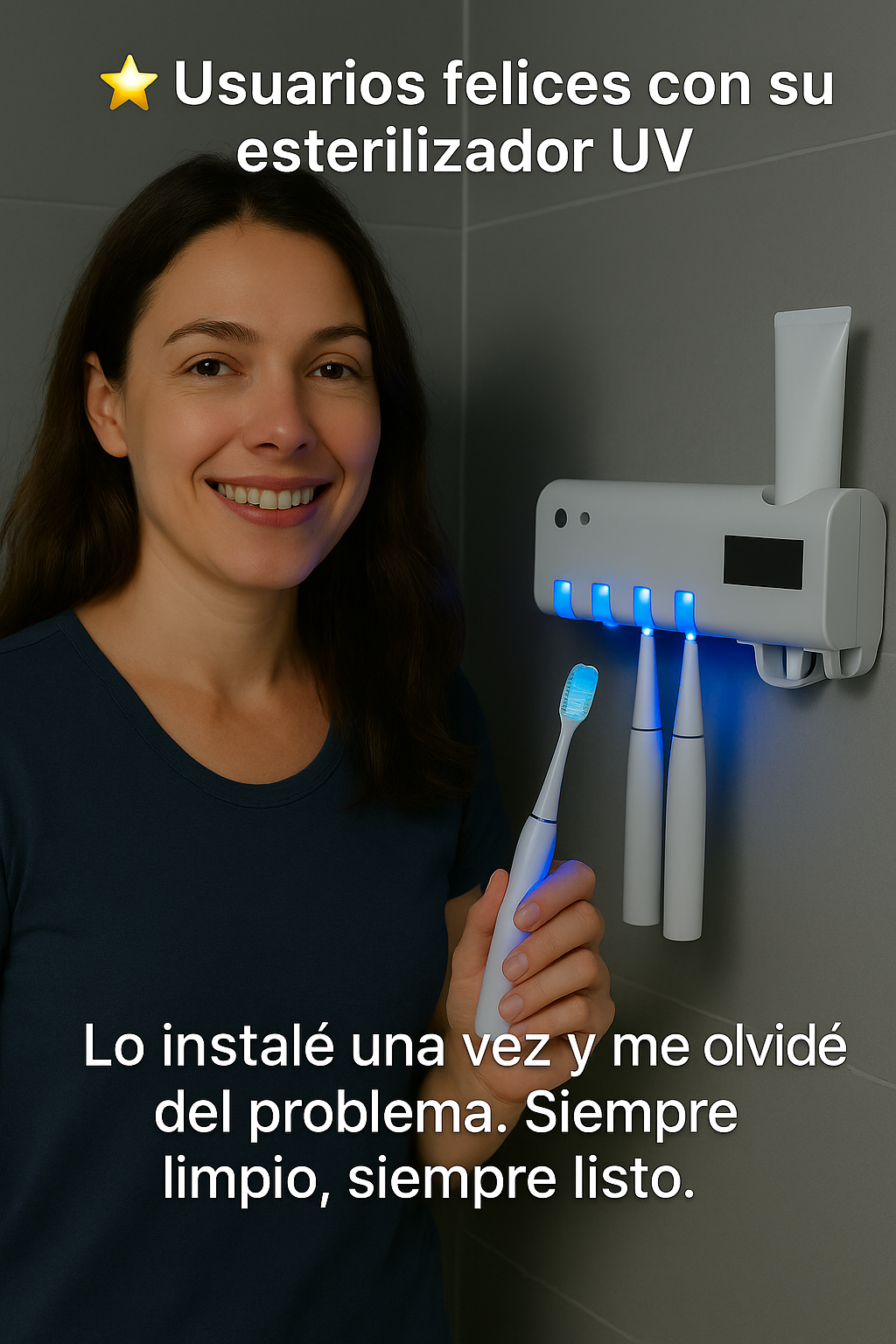 Pero eso no es todo: también ofrece un diseño compacto y multifuncional que no solo esteriliza, sino que dispensa pasta dental automáticamente, organiza tus cepillos (manuales o eléctricos), afeitadoras, hilo dental y más, todo en un solo lugar.